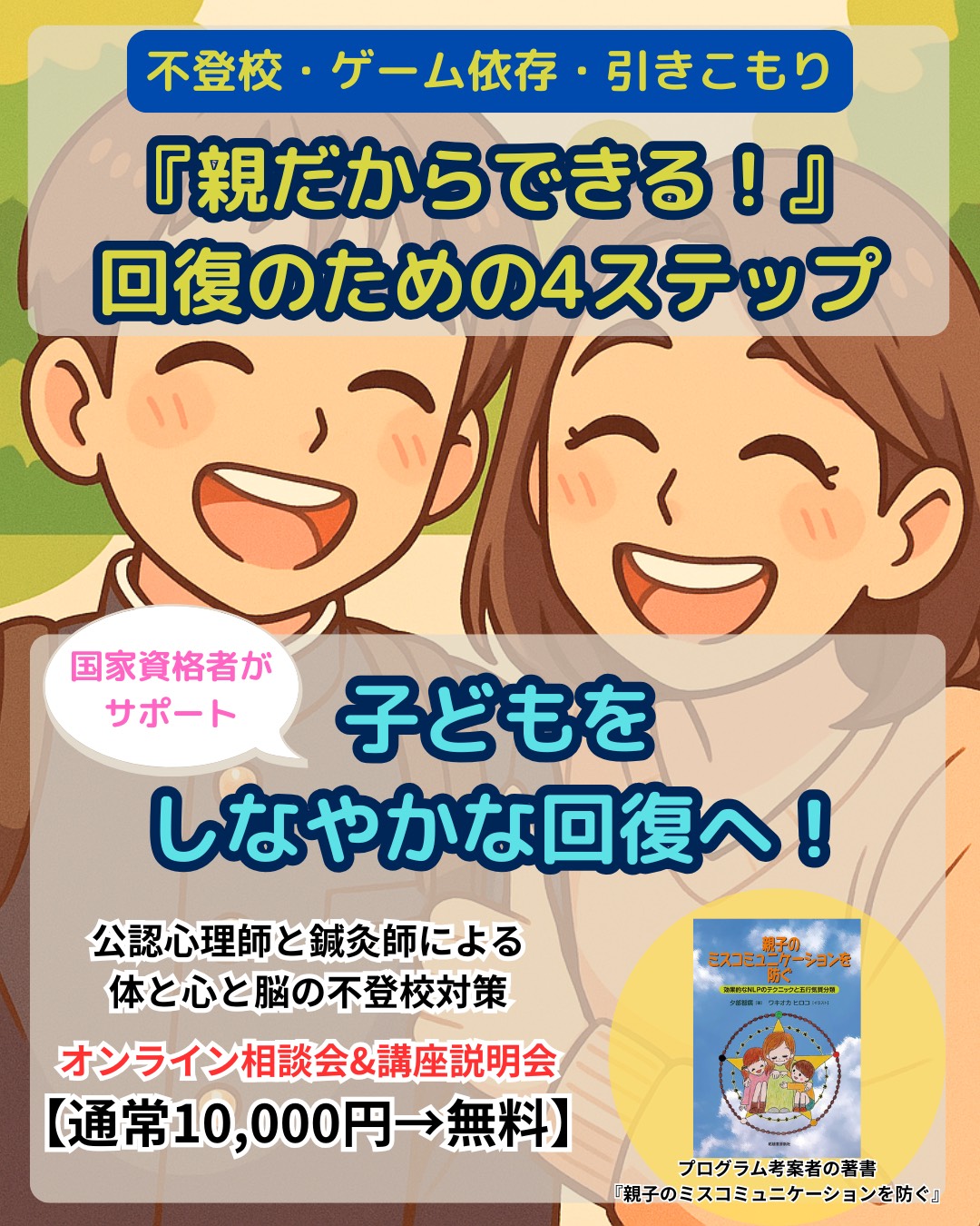 その方法は、『わたしの経験談』『わが子の体験談』など、対応例の分母が少なすぎではないですか? ➡ 当プログラムは、『心理学』『東洋医学』『コーチング』『依存メカニズム』など、根拠のバックボーンが存在し、今まで10年以上、200組以上の親子に実践してきた内容をまとめたものです。 年数や対応した人数がすべてではありませんが、根拠の分母が1~2例と少なすぎる場合だと、イレギュラーなケースへの対応が難しいかもしれません。 |